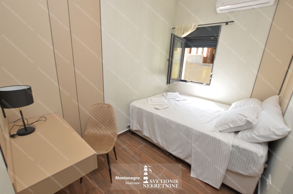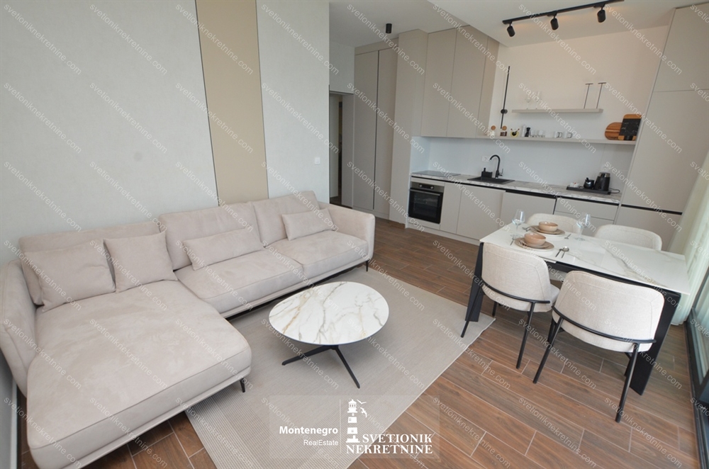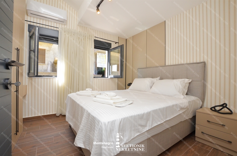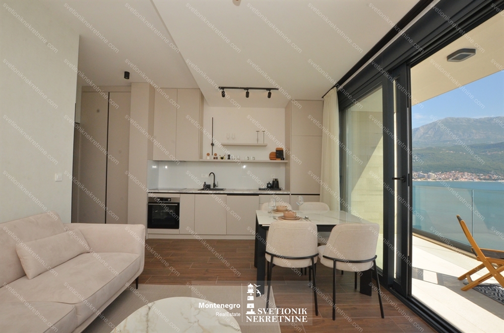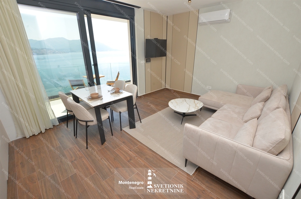 The apartment offers 59m² of interior space with a designer finish and panoramic views of the Bay of Kotor.