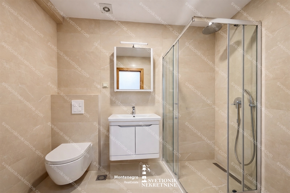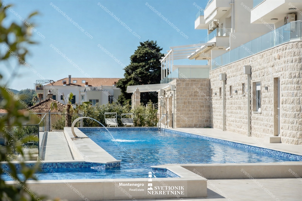 Na prodaju luksuzan dvosoban stan povrsine 87m2, smjesten u zatvorenom kompleksu u Baosicima, opstina Herceg Novi, na svega 100 metara od plaze.
