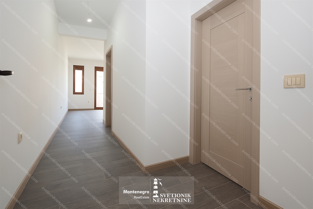 Sa terase se pruza prelep pogled na more i zelenilo koje se spusta prema Bokokotorskom zalivu, dok enterijer odlikuju svetle boje, neutralni tonovi drveta i savremen dizajn.