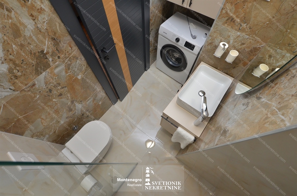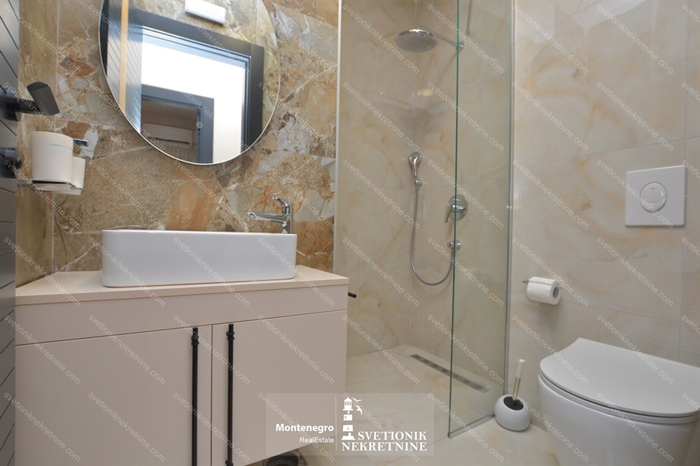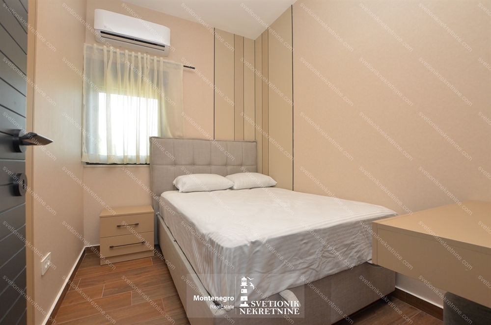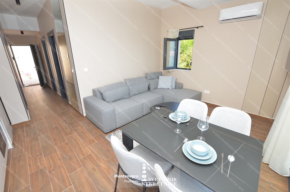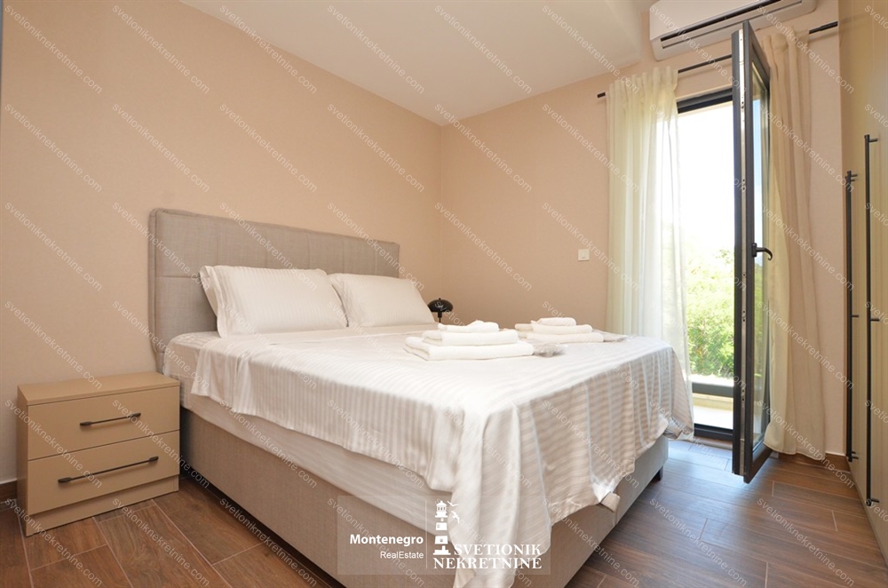 Stan je potpuno nov, opremljen kvalitetnim i modernim namestajem, sa terasom koja pruza fascinantan, otvoren pogled na zaliv. Lokacija je idealna za one koji traze mir, privatnost i pristup moru bez kompromisa.